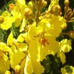 Имеет так же названия: Желтое Пламя, Цезальпиния Ржавая. Пелтофорум - это невероятно эффектное изящное роскошное полувечнозелёное дерево с ажурными дважды парноперистыми листьями, похожими на листья мимозы, но более тёмными и кожистыми. Ярко-жёлтые цветы собраны в вертикальные пышные соцветия, напоминающие "свечи" каштана. Кора, листья и древесина содержат танины. Порошок коры применяется как жёлтый краситель и в медицине.