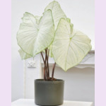 Листья каладиума на длинных мясистых черешках вырастают прямо из клубня. В естественной среде высота куста может достигать 5 м. Комнатные растения составляют 40-90 см в высоту. Стреловидная или сердцевидная листовая пластина имеет контрастную окраску. Длина листа составляет около 30 см, а ширина – 15 см. Так как листья являются основным украшением, существует множество видов и сортов растений с самой разнообразной окраской. Листва бывает малиновой, серебристой, розовой.